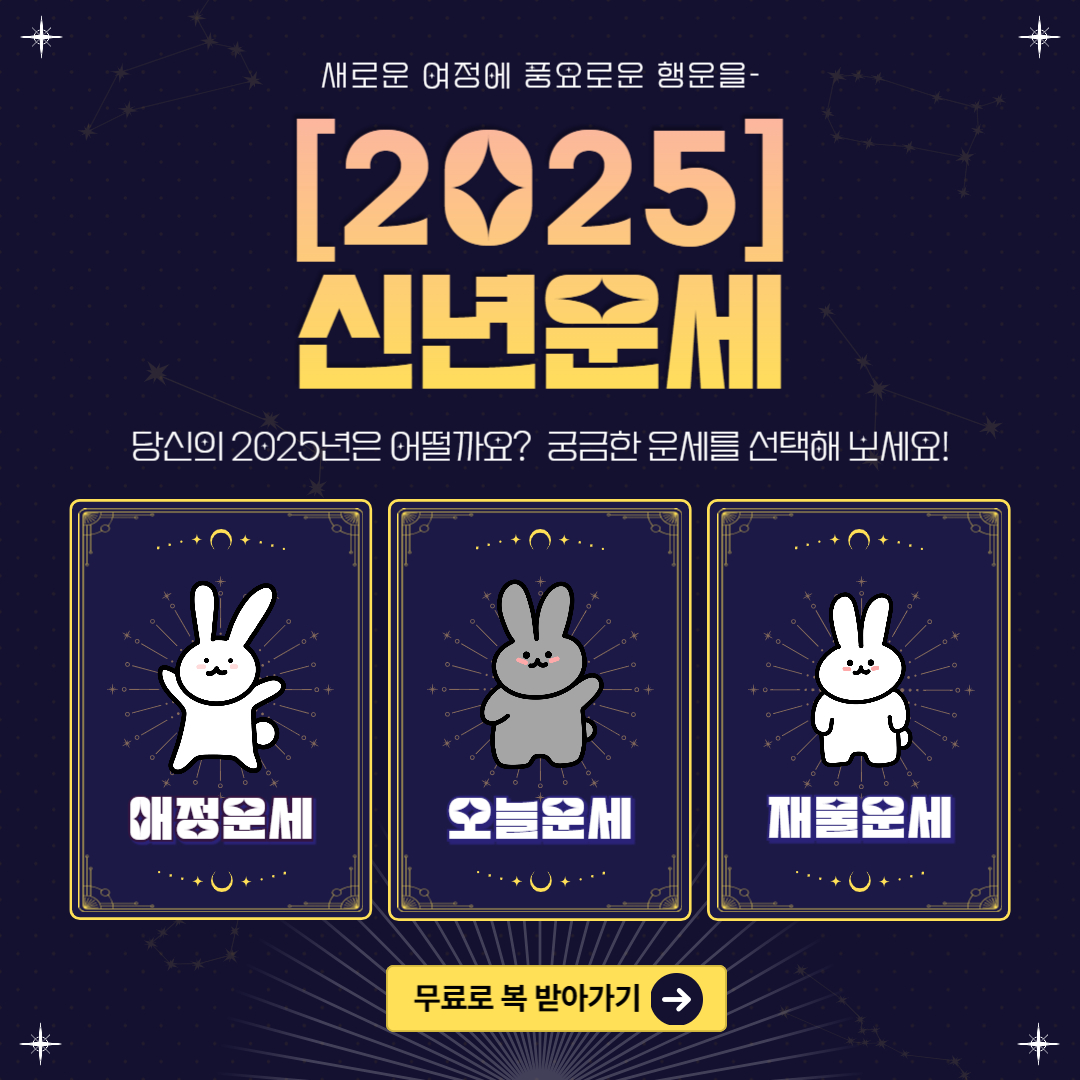 새해가 다가오면 많은 분들이 한 해의 운세에 대해 궁금해하십니다. 이에 발맞춰, 2025년을 맞이하여 무료 신년운세 사이트를 소개해 드립니다. 이 글을 읽는 모든 분들께서는 2025년에 좋은 기운을 받으시길 바라며, 소개해 드린 무료 운세 사이트를 이용해 보시고 좋은 일만 가득하시기 바랍니다.