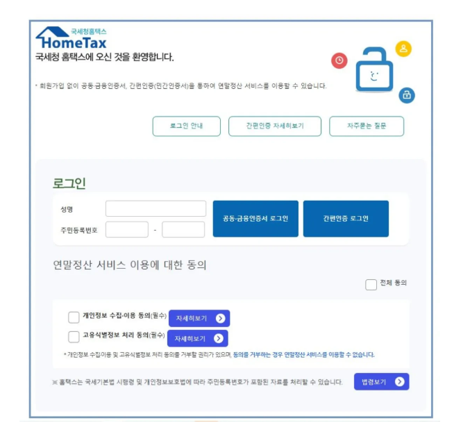 로그인은 공동 인증서, 금융인증서, 또는 간편 인증(카카오톡, 네이버 등) 방식 중 선택 가능합니다. 서비스 이용 약관에 전체 동의 후 로그인하세요.