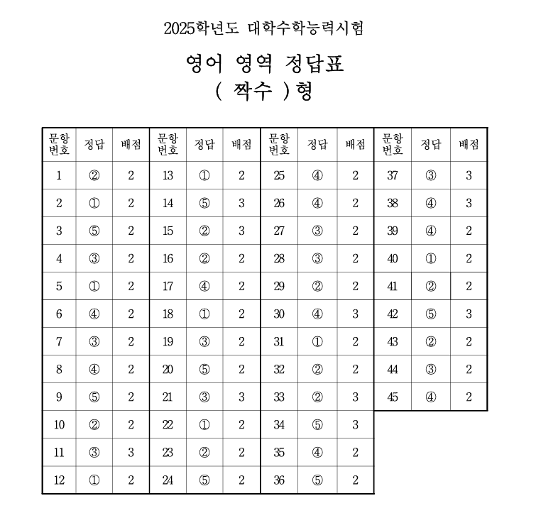 2025학년도 수능시험이 11월 14일에 진행되었습니다. 시험이 종료된 후, 문제와 채점을 위한 정답을 찾는 분들을 위해 2025학년도 수능 문제 및 정답을 첨부하였습니다. 필요한 분들은 다운로드하여 활용하시기 바랍니다.